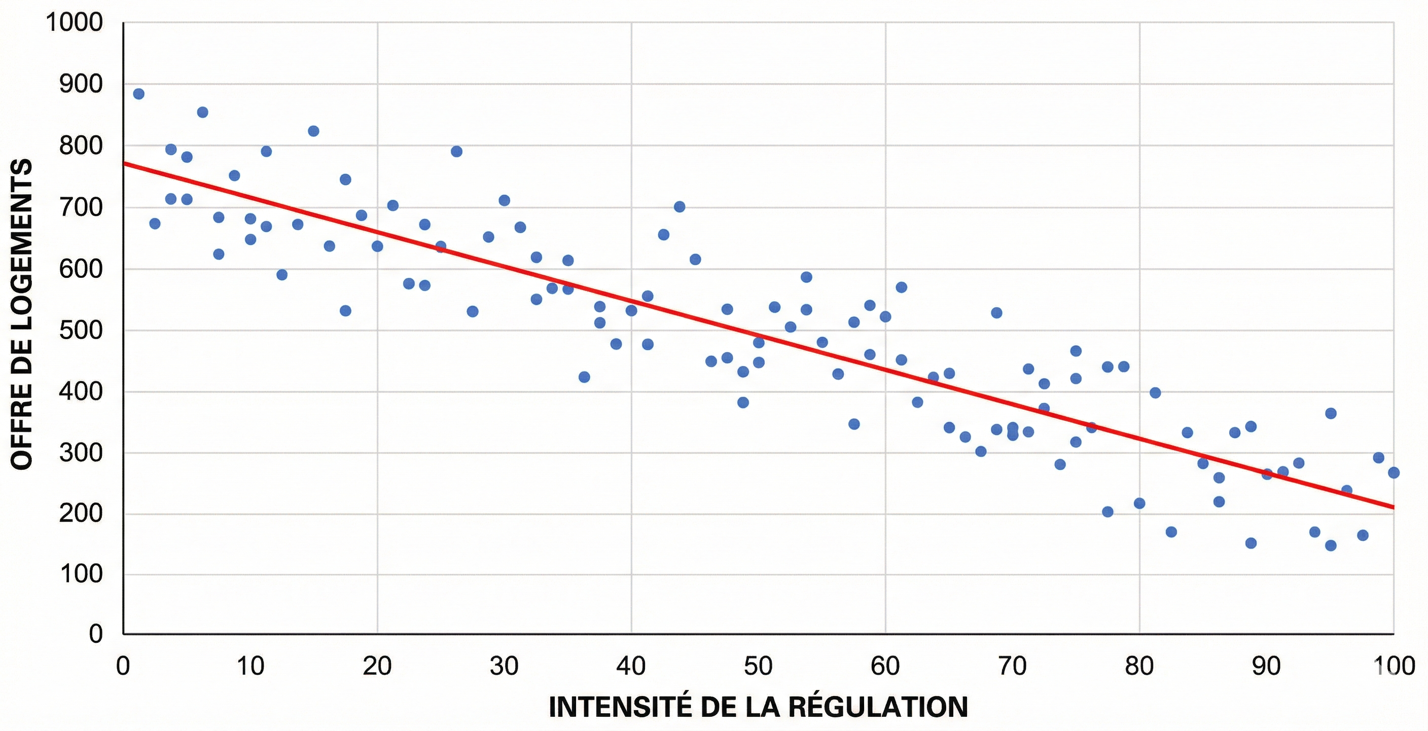 L’outil de base de l’économètre est la régression linéaire. L’idée est simple. Si on veut étudier l’impact du contrôle des loyers sur l’offre de logements, on commence par collecter des données sur des dizaines de villes. On place ensuite ces points sur un graphique (en ordonnée l’offre de logements, en abscisse l’intensité de la régulation3) et on trace la droite qui passe « au plus près »4 de tous ces points, comme sur la Figure 3 (données fictives). Si la droite descend, l’économètre pourrait être tenté d’affirmer « Plus le contrôle est fort, plus l’offre baisse ».