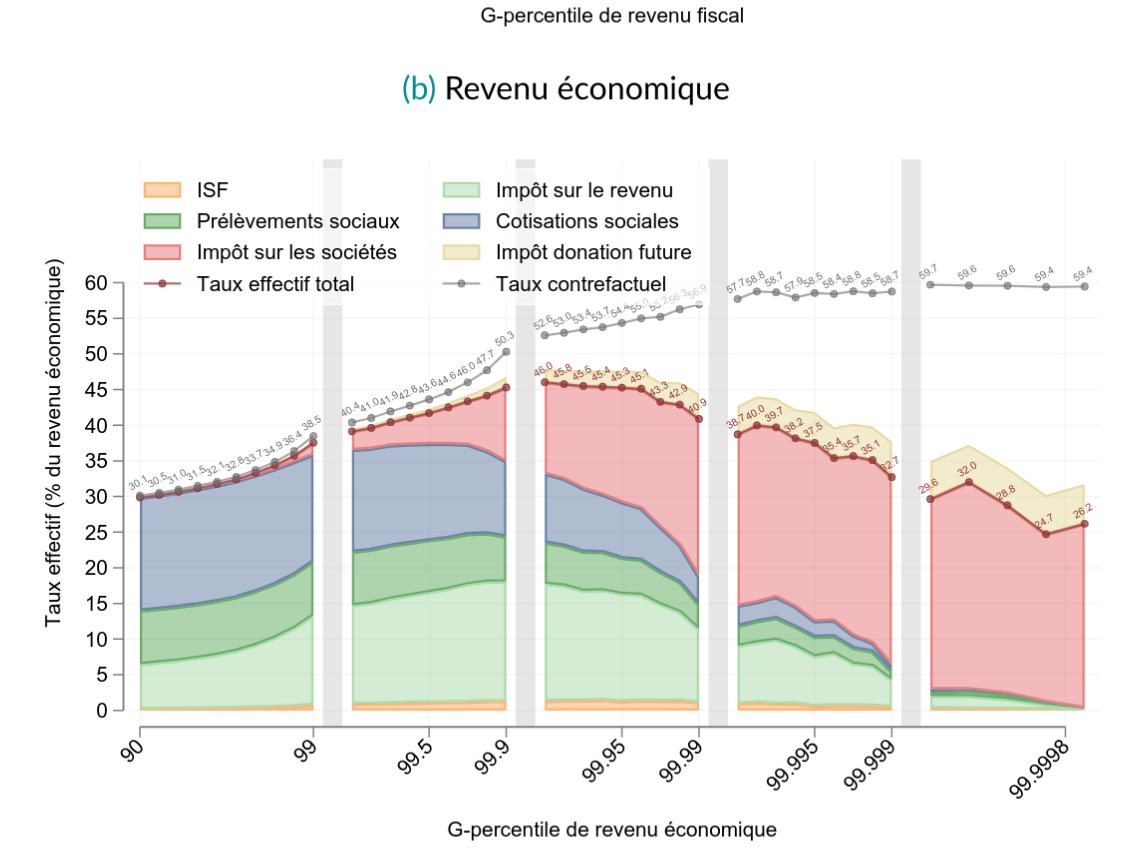 La raison en est que l’étude A provient des données de l’Insee et de la DGFIP, notamment l’enquête ERFS - Revenus fiscaux et sociaux. Ces données mesurent le revenu fiscal réel, c’est-à-dire ce qui est déclaré sur la feuille d’impôt. Or, entre autres différences méthodologiques qui contribuent à expliquer l’écart de taux de taxation, l’étude B ne considère pas les revenus déclarés, mais introduit la notion de « revenu économique ». Ce concept consiste à ajouter aux revenus des contribuables les bénéfices non distribués des entreprises qu’ils contrôlent, c’est-à-dire de l’argent qui reste dans les caisses de la société et dont l’individu ne dispose pas réellement au quotidien, et surtout qui ont déjà été taxés ! Plus de détails sur ce point précis ici.