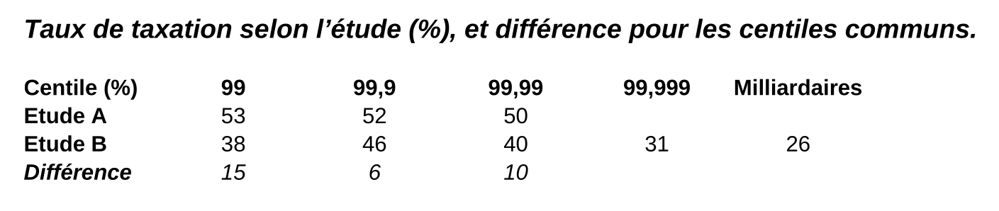 Le lecteur attentif aura peut-être déjà deviné le problème. En effet, la note de l’IPP, dont je mets le graphique phare en Figure 3, a aussi étudié les centiles avant 99,99% et la chute du taux de taxation. Or, les données de l’étude B ne concordent pas du tout avec celles de l’étude A sur les parties communes ! Je mets dans la Figure 4 un tableau récapitulant la situation, on y voit que la méthodologie de l’étude B donne un taux de taxation sensiblement inférieur à celle de l’étude A. Ainsi, passer d’un jeu de données à l’autre va nécessairement faire apparaître une chute du taux de taxation