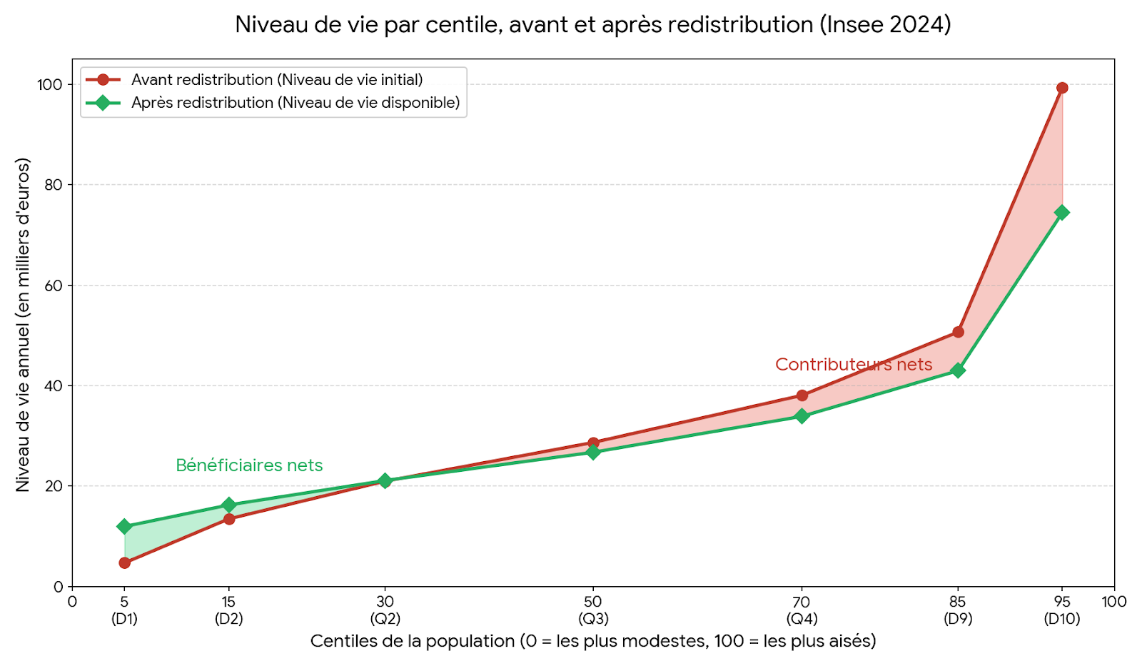 - Les revenus APRES redistribution : On compte la redistribution monétaire : les aides de la CAF, APL, RSA, prime d'activité. On ne compte pas la valorisation des services publics desquels chacun bénéficie (et devrait financer lui-même en leur absence) ni les avantages non monétaires comme les transports moins chers, le prix de la crèche ou de la cantine fixé en fonction des revenus, etc...